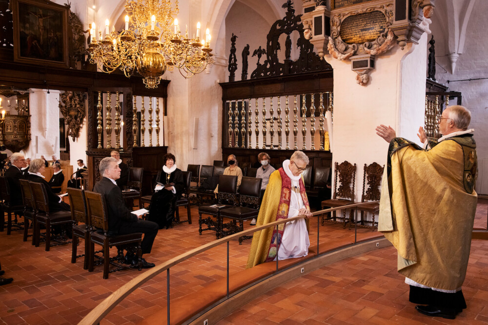 Solen skinnede over domkirken i Helsingør, da Peter Birch blev indviet til biskop. Som annonceret var det en stille bispevielse, fordi restriktionerne mod covid-19 betød, at gudstjenesten skulle holde sig inden for en halv time, der kunne kun være få mennesker til stede i kirken, og salmerne kunne kun synges af kirkesangerne, mens de øvrige deltagere måtte nøjes med at nynne.