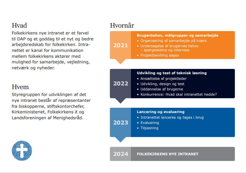 Formålet med dagen er at give de ansvarlige mulighed for at udvikle det bedst mulige nye intranet, som i virkeligheden er et kombineret intra- og ekstranet. Planerne er nemlig, at kun det nødvendige skal placeres bag log-in. Resten skal være tilgængeligt på en åben platform, som alle, der interesserer sig for kirken, kan komme ind på.