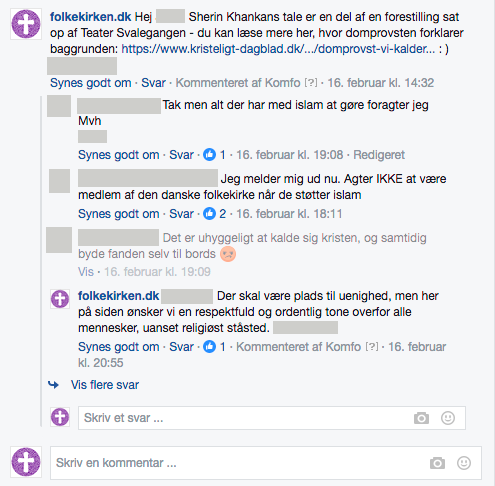 Folkekirken kan aldrig stille sine platforme til rådighed for kommentarer, der blot vil opildne til had. Folkekirken er på Facebook for at bidrage til en nuanceret samtale, ikke for at bidrage til polarisering. En debat på sociale medier bør være lige så respektfuld, som hvis man mødtes i virkeligheden og diskuterede.