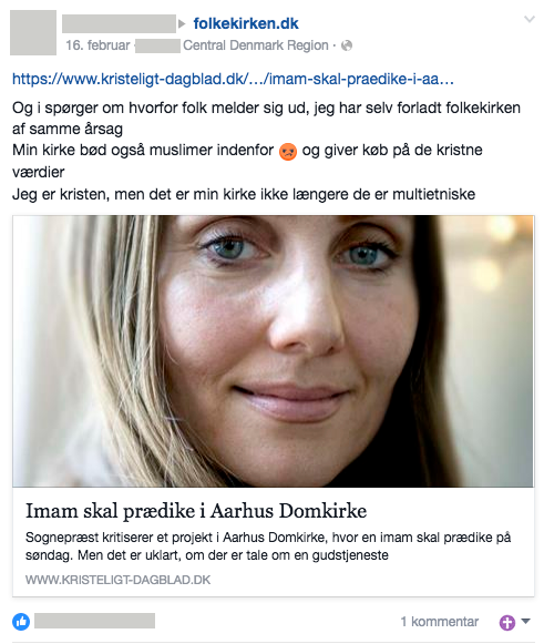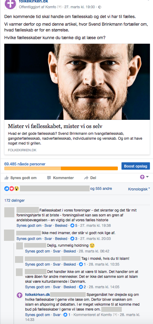 I en artikel, hvor Svend Brinkmann udtaler sig om fællesskab, og spørgsmålet på Facebook lyder ’Hvilke fællesskaber kunne du tænke dig at læse om?’ svarer en bruger ’Ikke med imamer, der står vi godt nok lige af’. Kommentarerne om islam begynder at rulle, selvom artiklen handler om fællesskab.