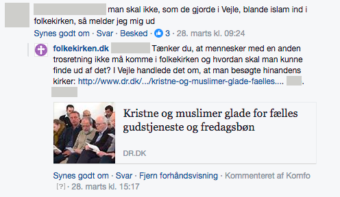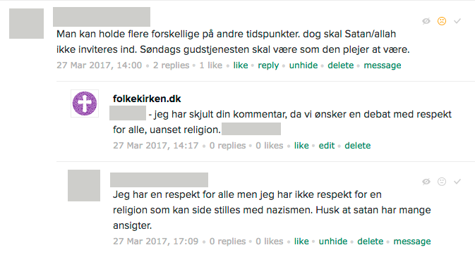 På folkekirken.dk’s Facebookside går to temaer igen, når det handler om bevidste forsøg på at afspore debatten og komme med hadefylde ytringer: Om islam og om at tro generelt. Sidstnævnte i form af nedsættende kommentarer om alle mennesker, der tror.