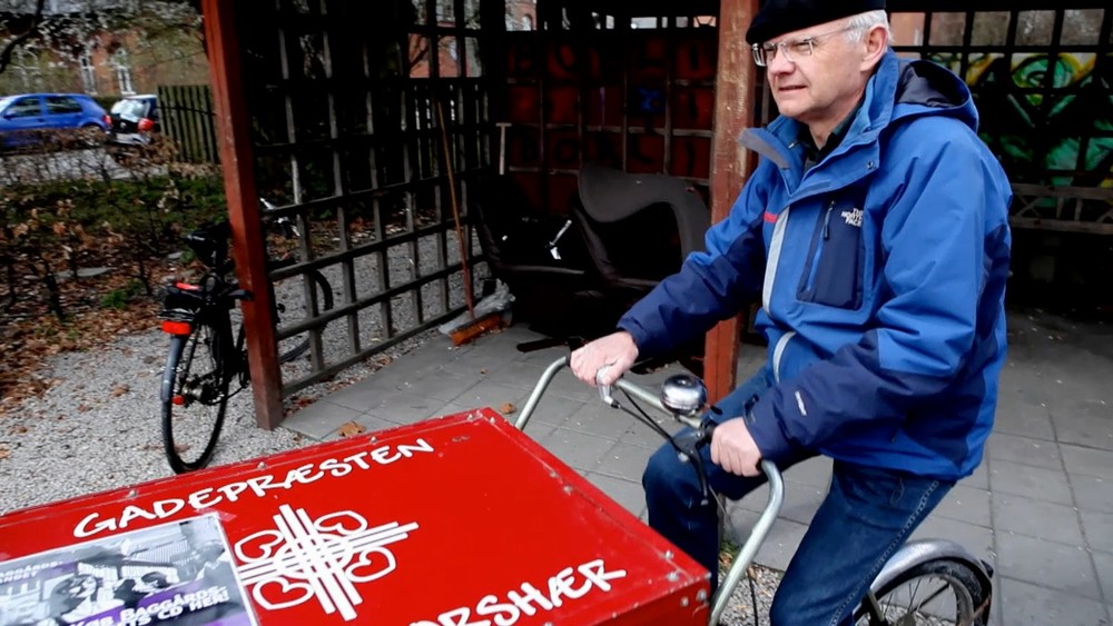 Korshærspræst Peder Thyssen cykler rundt blandt Odenses udsatte med kaffe og tid til en samtale. Fra videoen 'Folkekirken tæt på: Socialt udsatte'.