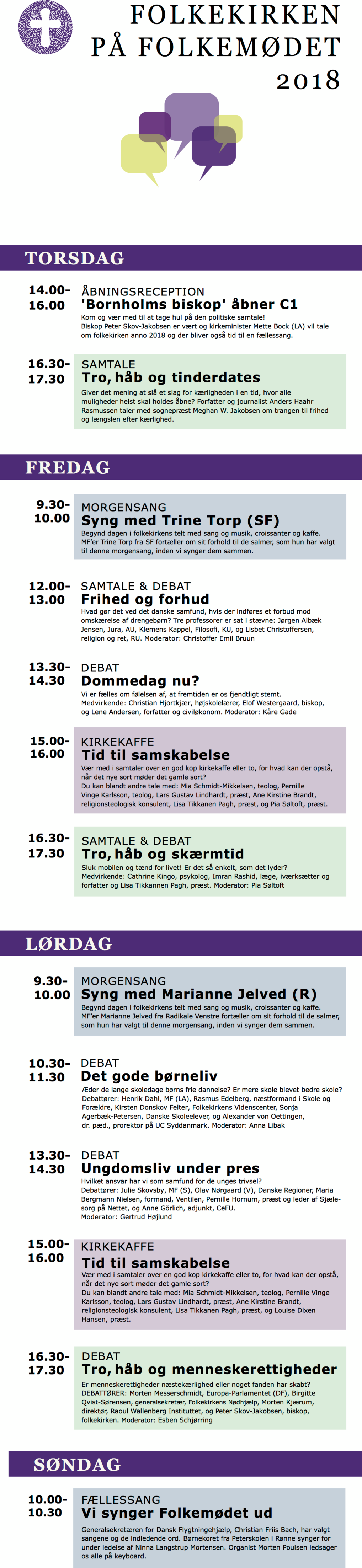 Folkekirken slår igen i år teltet op på Folkemødet på Bornholm og inviterer indenfor til en række debatter. Fra ungdomsliv under pres og menneskerettigheder til dommedag og Tinderdates.