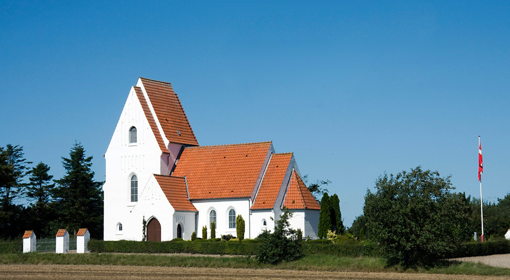 Landsognene har større lokal opbakning end bykirkerne, hvis man ser på kirkegangsprocenten. Den er nemlig højere på landet end i byen. Her ses Væggerskilde Kirke nær Spjald i Vestjylland. Kirken ligger i et landsogn med cirka 350 indbyggere.