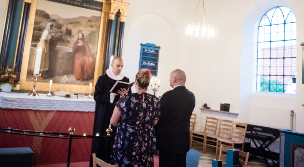 Klokken er 19.00, og kirketjeneren giver tegn til, at det er nu. Et øjeblik senere sidder Pinar Kofod og Robert Jensen foran alteret i Hornbæk Kirke. Nok er der kø for at komme til, men Rasmus Markussen, kirkens anden sognepræst, lader roen sænke sig over kirkerummet.