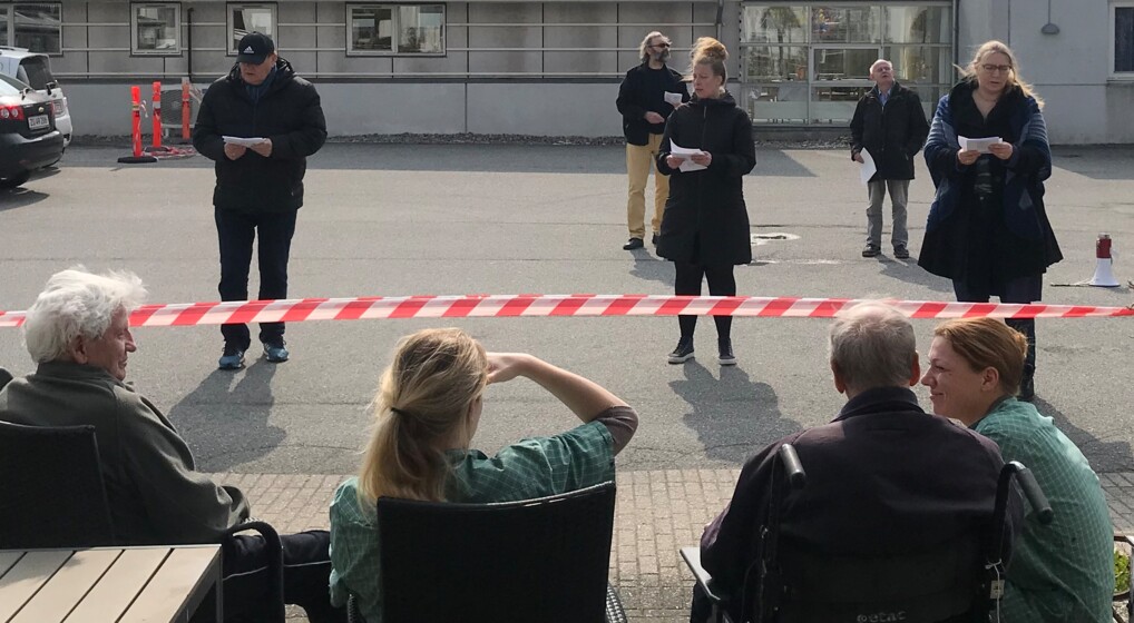 I påsken tog præster og korsangere fra Strandmarkskirken på gårdsangervisit hos det lokale plejehjem. Foto: Jesper Sørensen