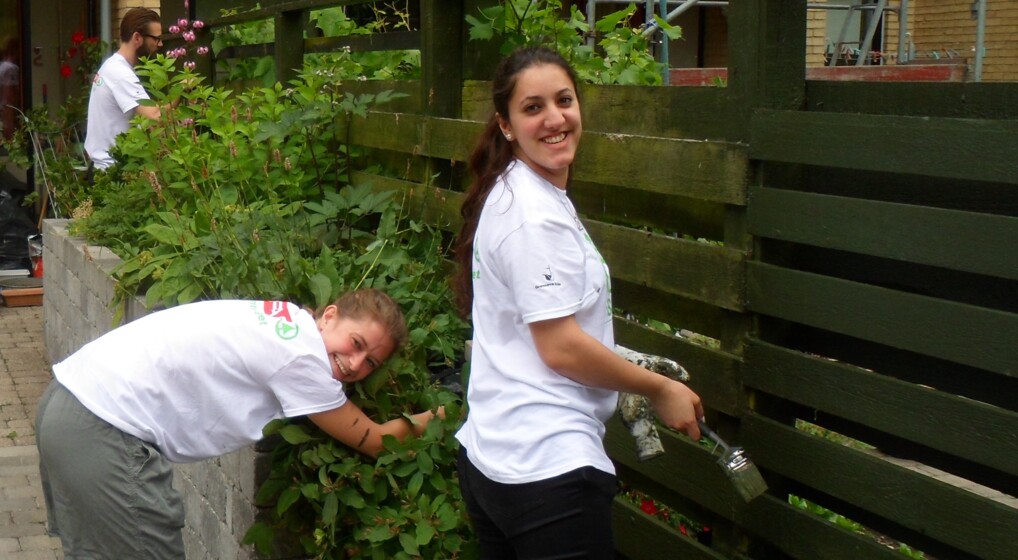 Tre studerende maler plankeværk hos en ældre, handicappet beboer under arrangementet ’Assist’, der er et samarbejde mellem boligforeningen i Kongevænget, Grønnevang Kirke og Kristeligt Forbund for Studerende.