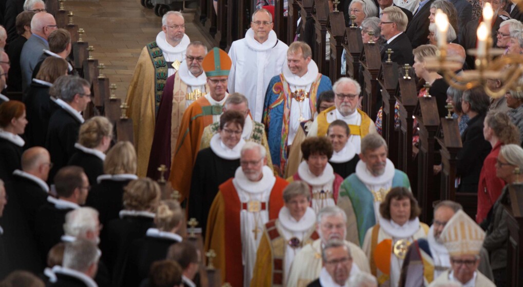 Folkekirkens biskopper er ikke et formelt ledelsesorgan eller et bispekollegium. Men de har mange fælles opgaver og udfordringer, som de drøfter på tre årlige bispemøder. Arkivfoto: Præster og biskopper fra folkekirken og de nordiske lande ved Henrik Wigh-Poulsens bispevielse i Aarhus Domkirke.