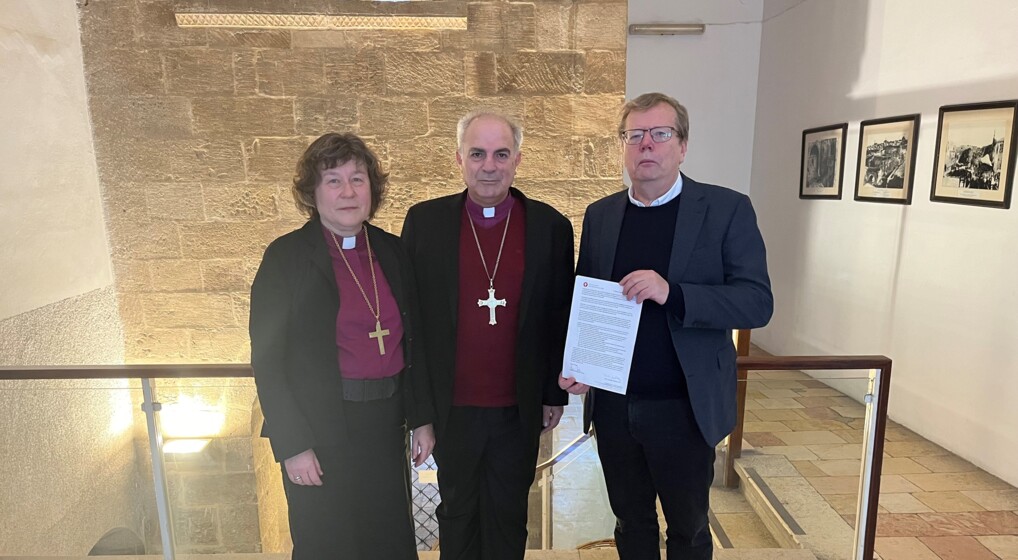 Fra venstre mod højre ses biskop i Haderslev Stift, Marianne Christiansen, biskop Azar fra den lutherske kirke i Jordan og Israel, formand for Folkekirkens mellemkirkelige Råd, Peter Lodberg. Foto: Den evangelisk-lutherske kirke i Jordan og Det Hellige Land.