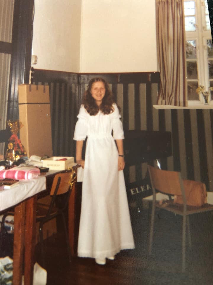 Jeg blev konfirmeret 7. maj 1982 i Sdr. Vilstrup Kirke ved Kolding. Kjolen blev lånt hos naboen, som selv havde syet den til sit eget barnebarn. Der var hætte på og elastik i taljen. Var overhovedet ikke 'kjolepige' dengang - det er jeg i dag.