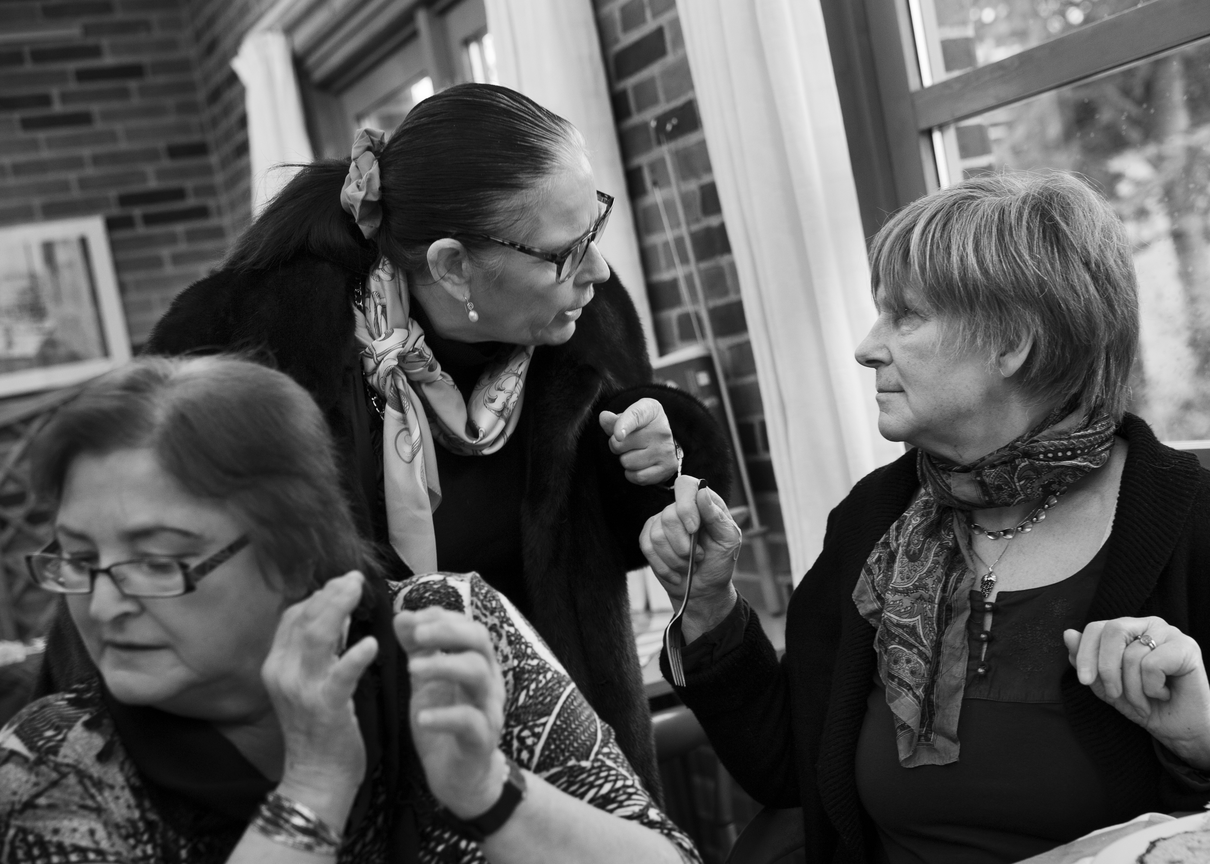 Ved nabobordet rejser Birgit Frausing sig fra sin faste plads og binder sit tørklæde. Hun har en lille portion forloren hare med sig hjem i en madkasse.