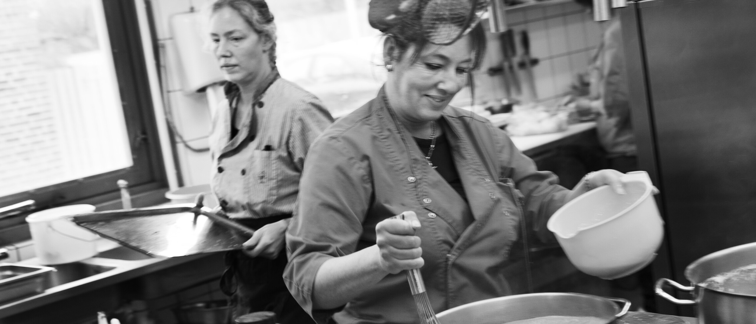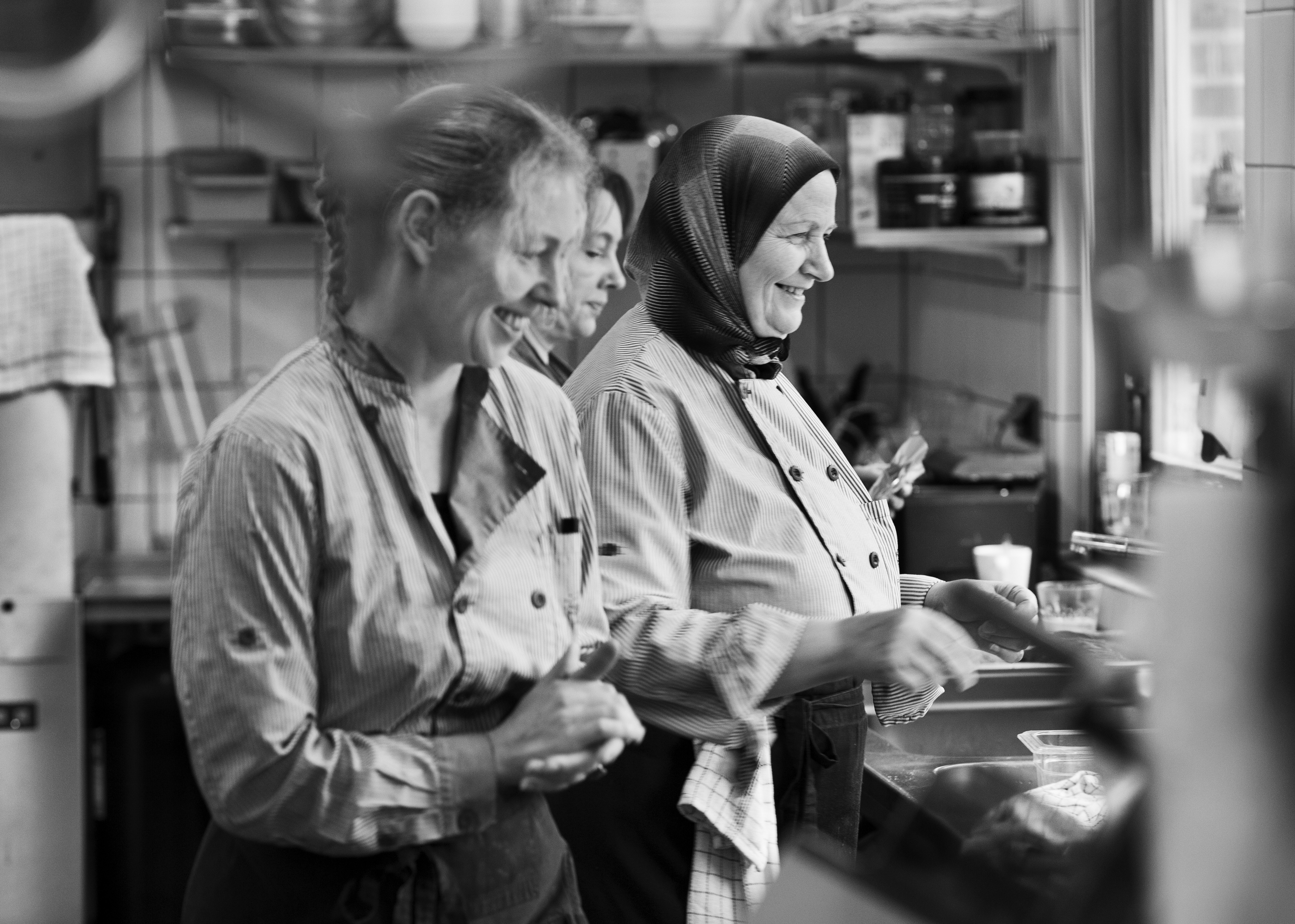 Her er Roxana Chelu, som er souschef og ansat af kirken. Her er Jytte Hansen, der tager sig af smørrebrødet, og hendes assistent Karina Hertsdahl, som er mor til to for tidligt fødte tvillinger. Her er Canan Karaca, der har været i køkkenet på en produktionsskole og helst laver desserter. Her er Lise Geisner Christensen, der tager sig af rengøringen, og som fortæller, at hun har flere uddannelser bag sig.