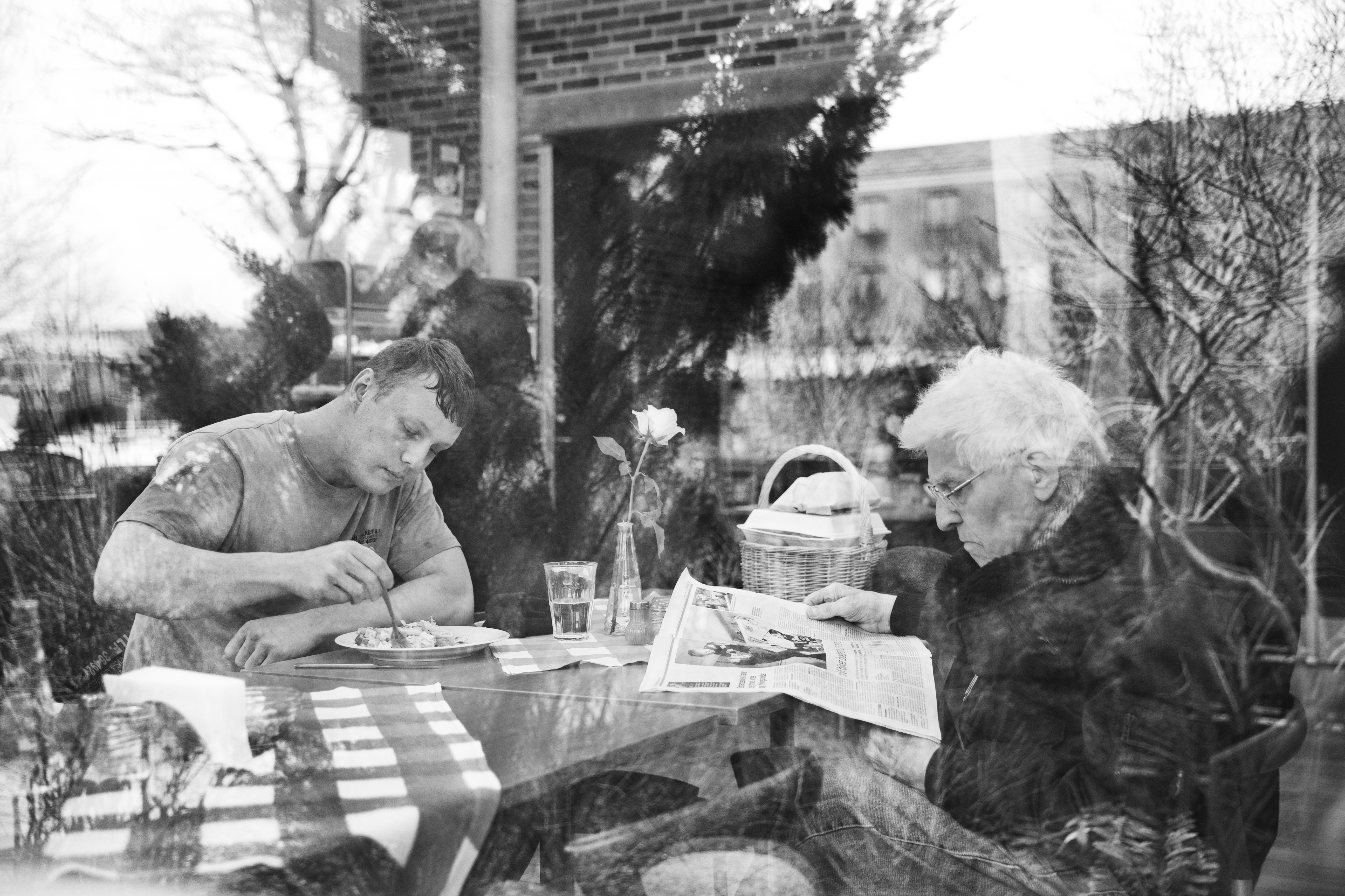 En kvinde lukker op, da jeg banker på køkkendøren. Hun fører mig gennem køkkenet, hvor en håndfuld medarbejdere er ved at begynde på dagens arbejde, giver mig en kop kaffe og placerer mig ved et bord i den tomme café.